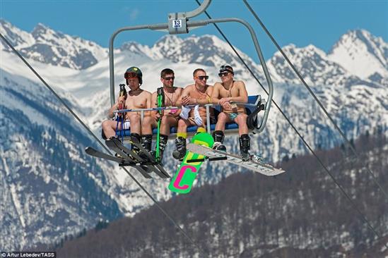 Những người đàn ông mặc quần bơi ngồi trên cáp treo, chân vẫn đeo ván trượt tuyết.