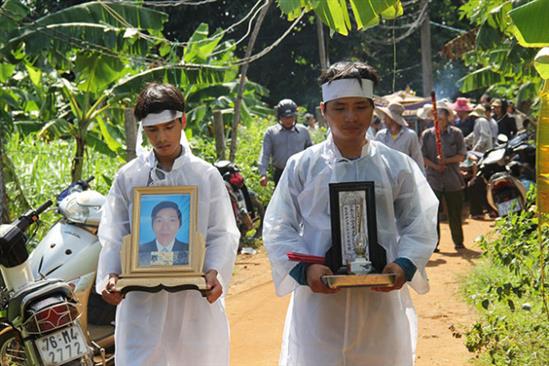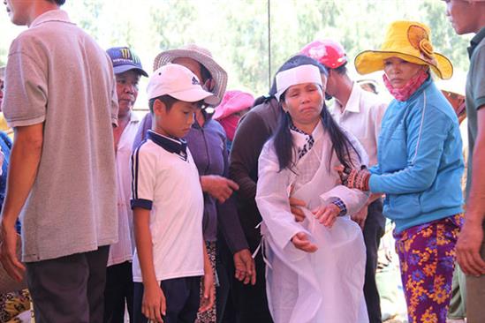Tiếng tụng kinh, tiếng khóc tạo nên một khung cảnh đau lòng. Bà Mai Thị Long, vợ ông Bảy và con gái Trương Thị Huệ không tự đi được phải có người dìu. Bà Long liên tục quỵ ngã trên đường ra nghĩa địa tiễn chồng về cõi vĩnh hằng.