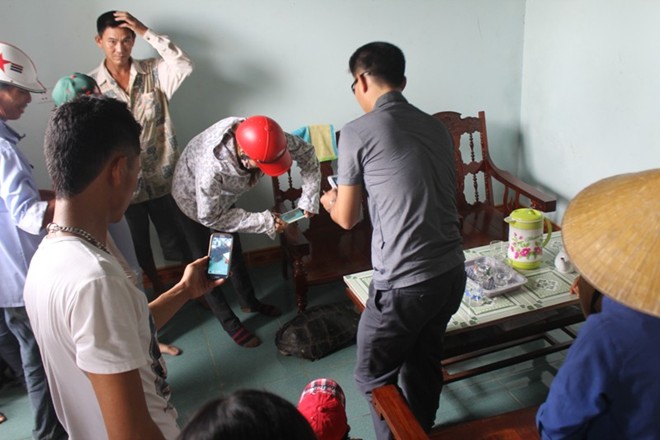 Sáng ngày 25/9, có rất đông người tập trung tại nhà gia đình bà Thái Thị Năm (SN 1969, ở xã Liên Thành, huyện Yên Thành, Nghệ An) để tận mắt xem một con rùa mà gia đình bà mới