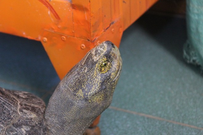 Đầu rùa có những viền màu vàng óng. Hiện tại lượng người đổ đến xem “rùa thần” của bà Năm vẫn đang rất đông. Có nhiều câu chuyện ly kỳ được thêu dệt xung quanh sự xuất hiện của con rùa này.