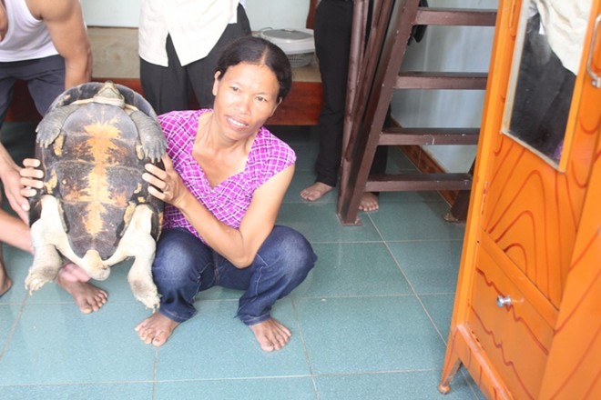 Bà Năm ôm con rùa mà bà phát hiện thấy ở cổng nhà mình.