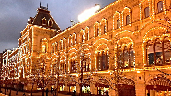 Tới thăm thủ đô Moskva du khách có cơ hội  ghé thăm trung tâm thương mại Quốc gia GUM được xây dựng giống lâu đài cổ kính từ thế kỷ 19. Trung tâm thương mại GUM với những gian hàng sang trọng như Dior, Chanel, Givenchi, Versace, BVLGARI, OMEGA… luôn là một điểm đến thu hút rất nhiều du khách khi đến với nước Nga. Mỗi khi đến mùa giảm giá các món hàng hiệu chất lượng đến được tay người mua với mức giá thấp hơn từ 30 – 70%, luôn làm nức lòng giới mộ điệu thời trang từ nhiều nơi trên thế giới.