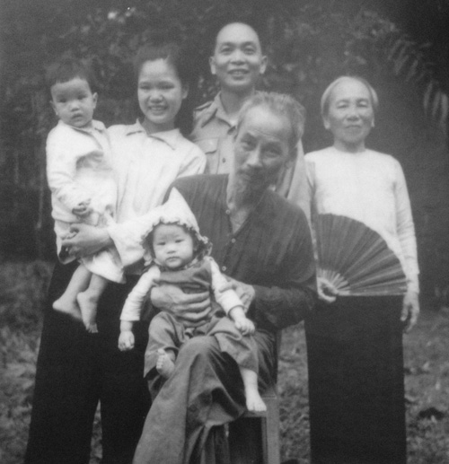 Chủ tịch Hồ Chí Minh và gia đình Đại tướng Võ Nguyên Giáp ở Việt Bắc năm 1953.