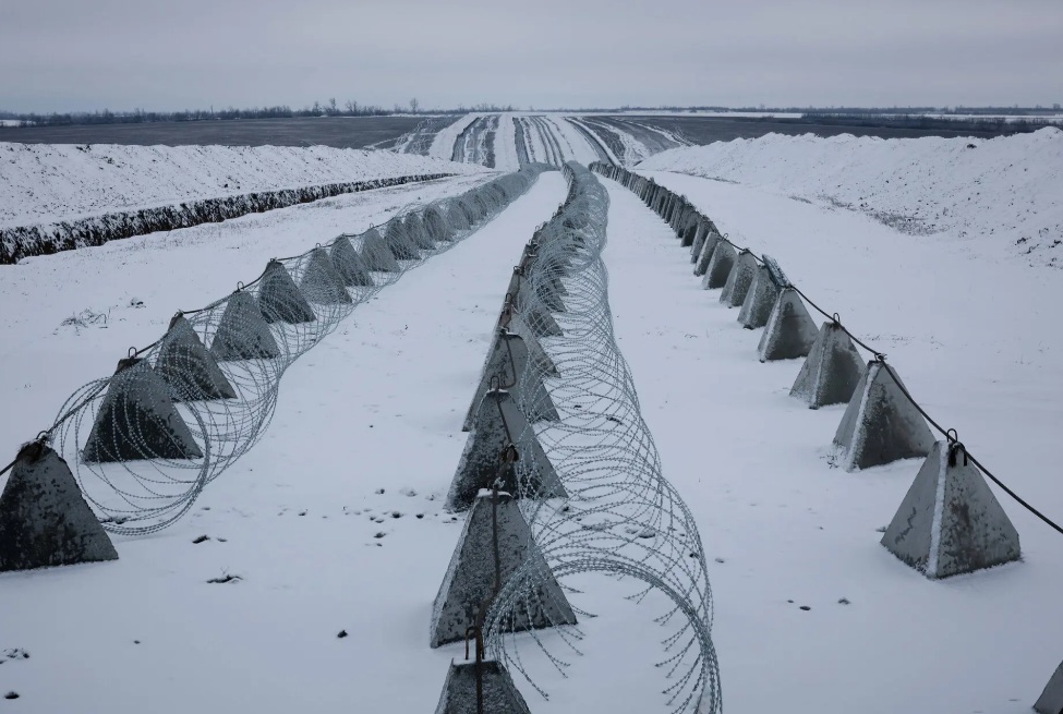 Dây thép gai và các "răng rồng" chống tăng trên một tuyến phòng thủ ở vùng Donbas vào tháng 1/2026. Ảnh: New York Times.