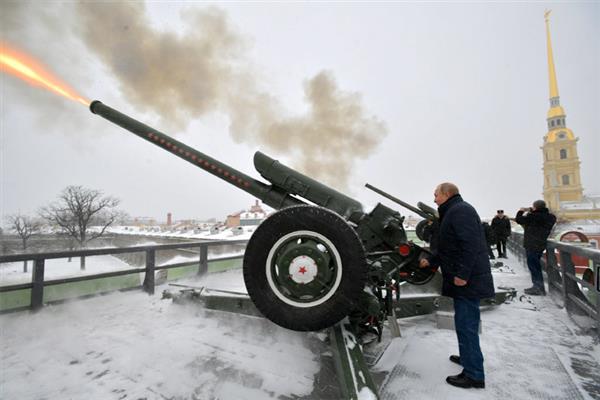 Putin khai hỏa khẩu pháo D-30 cỡ nòng 122mm bên bờ sông Neva. (Ảnh: Sputnik)