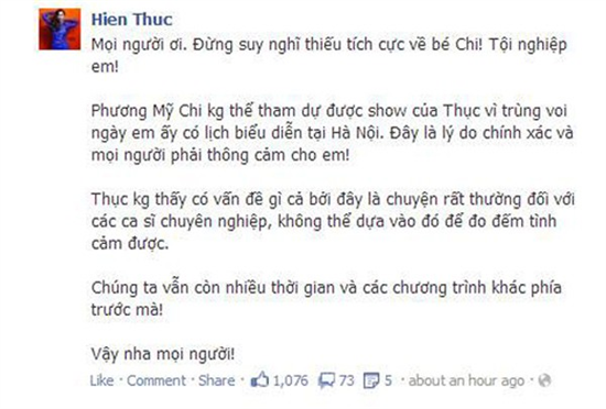"Mọi người ơi. Đừng suy nghĩ thiếu tích cực về bé Chi. Tội nghiệp em! Phương Mỹ Chi không thể tham dự được show của Thục vì trùng với ngày em ấy có lịch biểu diễn tại Hà Nội. Đây là lý do chính xác và mọi người phải thông cảm cho em.
