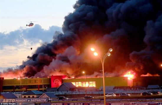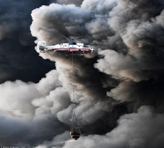 Trực thăng của lực lượng cứu hộ khẩn cấp Nga tham gia dập lửa tại khu chợ Sindika. Ảnh: TASS.