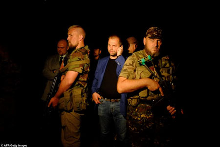 Thủ tướng tự xưng của Cộng hòa nhân dân Donetsk Alexander Borodai (giữa)có mặt tại hiện trường vụ máy bay rơi.