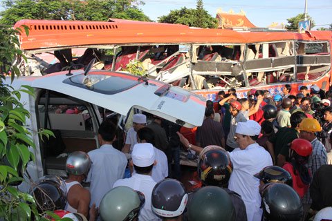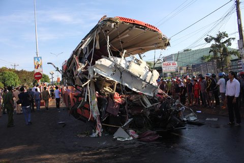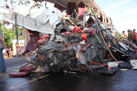 Chiếc xe khách nát bươm sau cú tông kinh hoàng.