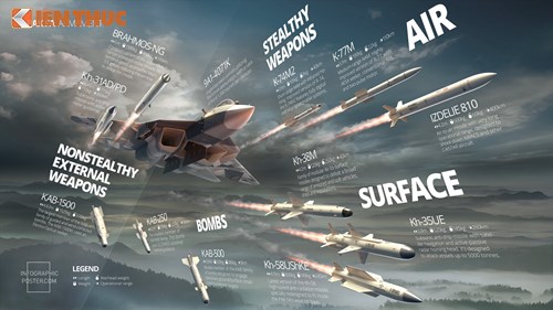 Máy bay chiến đấu Su-57 được thiết kế thuộc phân loại thế hệ 5 như các dòng máy bay F-22 và F-35 của Mỹ. Dòng chiến đấu cơ này có thể bay với vận tốc tối đa tới 2.600km/giờ, tầm hoạt động đạt 4.300km và trần bay cao là 20km. Su-57 có thể mang theo 10 tấn vũ khí, gồm: Một pháo hàng không GSh-30-1 30mm và các loại bom, tên lửa có điều khiển treo trên 8 mấu được giấu trong thân và 10 mấu cứng ở trên thân và cánh máy bay.