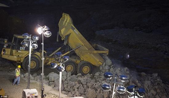 Các xe tải được huy động chở đá liên tục để vá đập tràn. Ảnh: Reuters