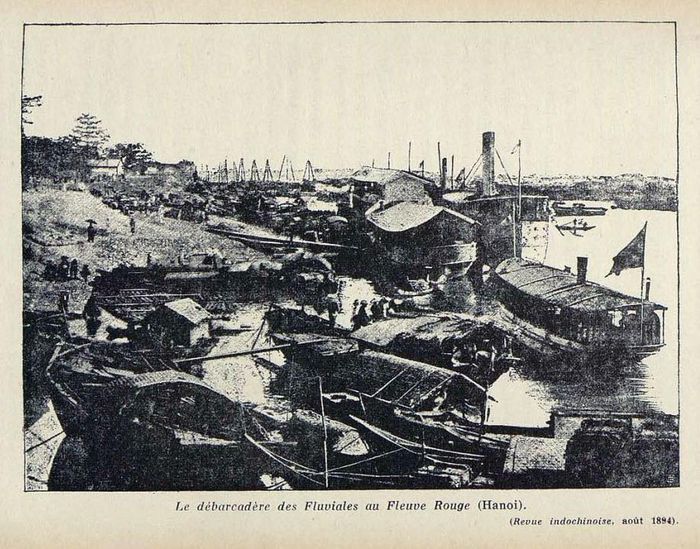 Tàu của hãng vận tải đường sông Messageries Fluviales ở bến sông Hồng, Hà Nội năm 1894.