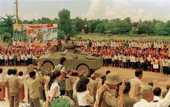Trưa 7/1/1979, quân đội Cách mạng Campuchia cùng quân tình nguyện Việt Nam tiến vào giải phóng Phnom Penh. (Nguồn: TTXVN)