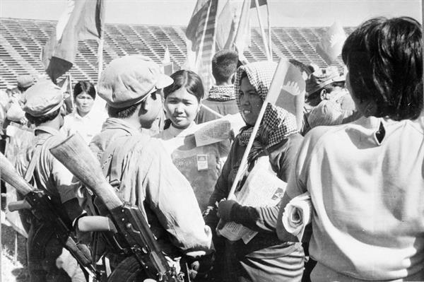 Hàng ngàn người dân thủ đô Phnom Penh lưu luyến tiễn đưa các chiến sỹ Quân đoàn 4 - Binh đoàn Cửu Long quân tình nguyện Việt Nam hoàn thành nghĩa vụ quốc tế, lên đường trở về nước, sáng 2/5/1983. (Nguồn: TTXVN)