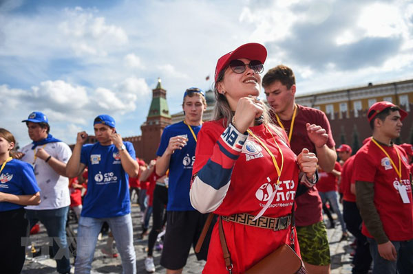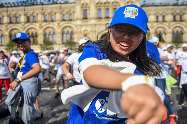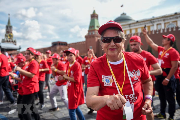 Hơn 4000 người đã tham gia buổi luyện tập boxing trong ngày boxing quốc tế lần thứ 3 tại Quảng trường Đỏ ở Moskva, Nga, ngày 21/7/2019. (Nguồn: THX/TTXVN)