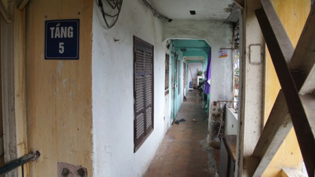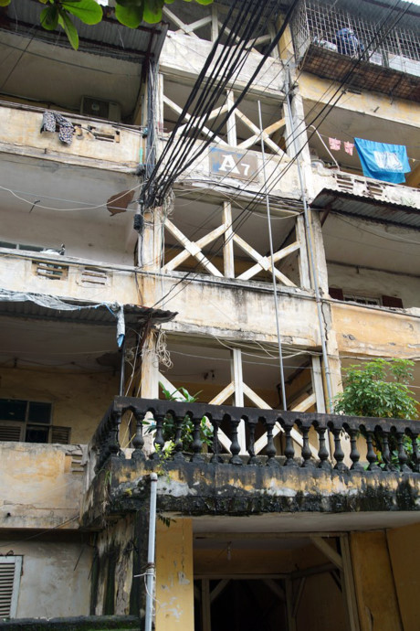 "Năm 2010, khi khu vực cầu thang bộ nối từ tầng 1 lên tầng 5 có dấu hiệu tách rời nhau, gây nguy hiểm đến toàn bộ kết cấu khu tập thể thì Cty Quản lý và Phát triển nhà Hà Nội – đơn vị quản lý tòa nhà đã cho người xuống lắp hệ thống giàn giáo thép nhằm gia cố, chống đỡ tạm thời" Một cư dân trong khu tập thể này cho biết.