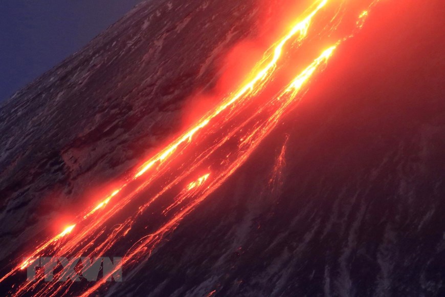 Theo ghi nhận của các chuyên gia Viện nghiên cứu núi lửa và địa chấn thuộc Viện Viễn Đông Nga, có thời điểm các dòng dung nham tuôn trào từ miệng núi lửa kéo dài đến 1,5km. (Ảnh: Trần Hiếu/TTXVN)