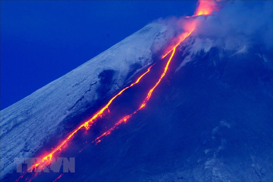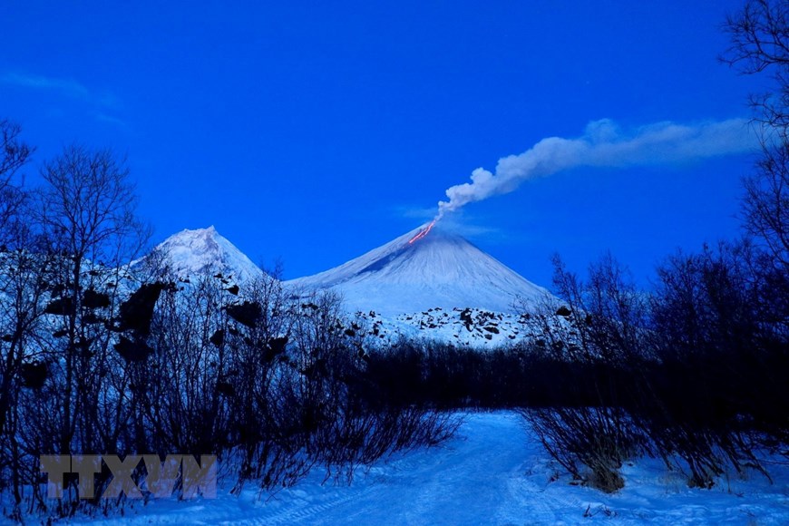 Sau một thời gian bắt đầu hoạt động trở lại từ cuối tháng 11, ngọn núi lửa Kliuchevsky trên bán đảo Kamchatka, vùng Viễn Đông của Liên bang Nga, đã xuất hiện các đợt phun trào dung nham với cường độ mạnh. (Ảnh: Trần Hiếu/TTXVN)