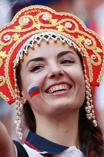 Nữ cổ động viên Nga xinh đẹp trên khán đài sân vận động Luzhniki theo dõi trận đấu giữa đội chủ nhà và đội tuyển Tây Ban Nha hôm 1/7. Trận này, Nga đã giành chiến thắng sau loạt đá penalty cân não.
