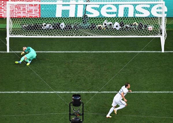 Khoảng khắc tiền đạo Dzyuba của đội tuyển Nga thực hiện thành công quả đá 11m quân bình tỷ số 1-1 cho đội tuyển Nga trong trận đấu với Tây Ban Nha.