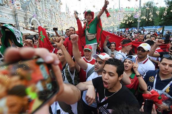 Cổ động viên của Morocco khuấy động không khí trên đường Nikolskaya ở Moscow.