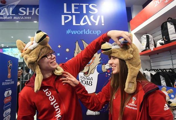 Hai tình nguyện viên đội trên đầu chiếc mũ có hình chú sói Zabivaka - linh vật chính thức của FIFA World Cup 2018.
