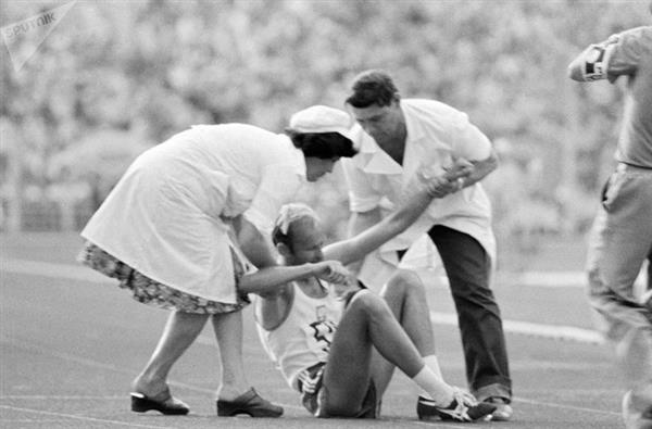Các nhân viên y tế chăm sóc cho một vận động viên trên đường chạy tại Olympic 1980.