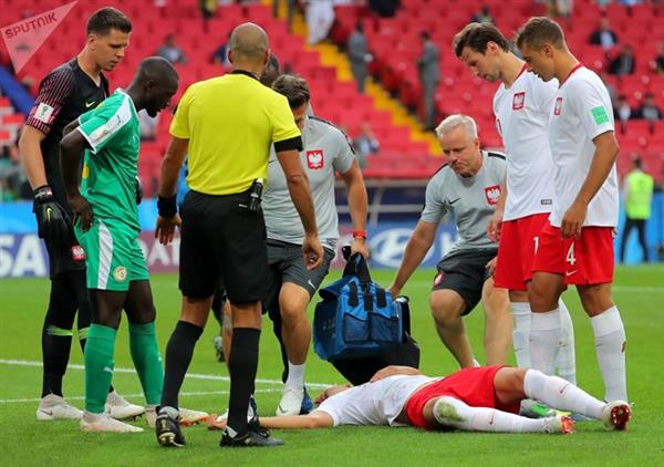 Hậu vệ đội tuyển Ba Lan Jan Bednarek được các bác sĩ chăm sóc trong trận đấu giữa Ba Lan và Senegal tại World Cup 2018.