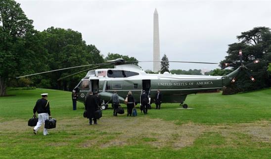 Chiếc Marine One đỗ trong khuôn viên Nhà Trắng, chuẩn bị đưa Tổng thống tới căn cứ quân sự Andrews. Chiếc trực thăng lên thẳng này cũng sẽ hộ tống Tổng thống trên đường di chuyển bằng ô tô riêng từ sân bay Nội Bài về trung tâm Hà Nội