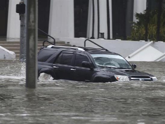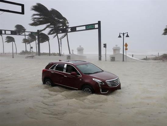 Một chiếc xe chật vật đi trên một con đường ngập sâu trong nước lũ do bão Irma gây ra.