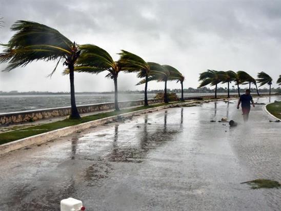 Hai người đàn ông chật vật đi trong gió to và mưa lớn do bão Irma gây ra.