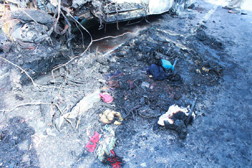 Xe ô tô kéo rơ móc bị lật đổ do bị đâm với lực lớn cũng như áp lực vụ nổ do các bình gas gây ra.
