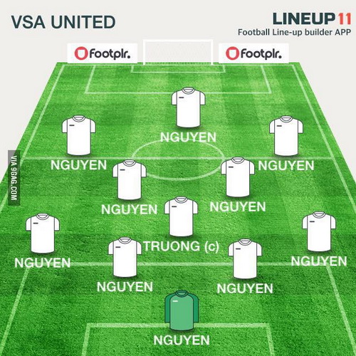 Đặc biệt, trong một ảnh chế hài được chia sẻ rất nhiều trên các trang mạng còn phản ánh rõ sự phổ biến của họ Nguyễn ở cộng đồng nước ngoài. Như trong đội hình tuyển bóng đá sau, có đến 10 cầu thủ mang họ Nguyễn và chỉ 1 người mang họ Trương. Tác giả thậm chí còn hài hước ở chỗ cho nhân vật duy nhất kia được giữ băng đội trưởng.