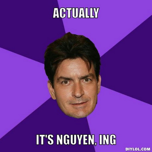 - Xin giới thiệu, tôi là Nguyễn. Và đây là Nguyễn, Nguyễn, Nguyễn, Nguyễn, Nguyễn, rất hân hạnh được quen anh. - Xin lỗi, tên của anh là gì, tôi nghe không kịp: "Nguyễn", "À vâng, Nguyễn"