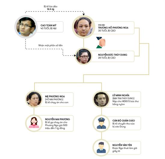 Trả lời HĐXX, bị cáo Thùy Dung xác nhận giữa ông Mỹ và Phương Nga có mối quan hệ tình cảm. Tuy nhiên sau khi phẫu thuật thẩm mỹ, Nga muốn chia tay nên anh Mỹ đòi lại 16,5 tỷ. Đồng thời Dung cũng cho biết, thông qua tài khoản của Dung ông Mỹ đã chuyển cho Phương Nga tổng cộng 9,5 tỷ đồng.