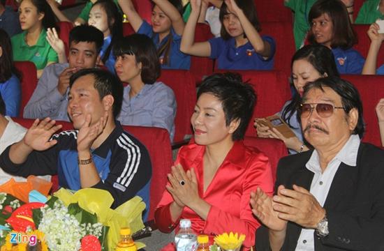 Từ trái qua: Xạ thủ Hoàng Xuân Vinh, huấn luyện viên Nguyễn Thị Nhung, cựu Trưởng đoàn TTVN Nguyễn Hồng Minh hát trong buổi giao lưu với thanh niên Hà Nội. Ảnh: Ngân Giang