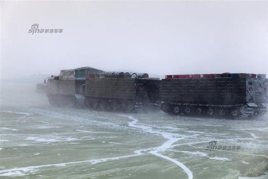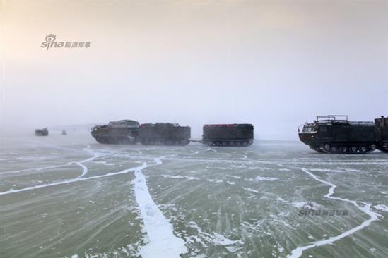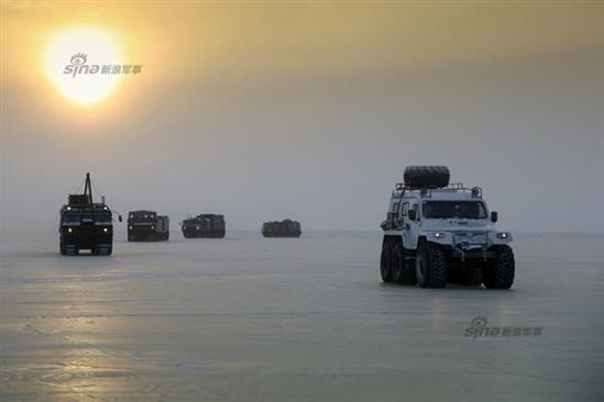Mặt băng trơn trượt nên các loại xe đi trên băng đặc chủng cần phải được thiết kế để chống lại việc đó bằng cách trang bị lốp có ta-lông cực lớn hoặc đơn giản hơn là sử dụng bánh xích. Trong ảnh, đội hình xe di chuyển trên băng của Quân đội Nga bao gồm các loại xe bánh lốp và xe bánh xích. Nguồn ảnh: Sina.