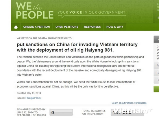 Tính đến chiều 29/5, có hơn 130.000 người Việt từ khắp mọi nơi trên thế giới ký Thỉnh nguyện thư gửi Nhà Trắng đề nghị Mỹ áp đặt các biện pháp trừng phạt Trung Quốc về hành động "xâm lược lãnh thổ Việt Nam" thông qua việc đưa giàn khoan dầu Hải Dương-981 (Haiyang Shiyou 981) vào Vùng đặc quyền kinh tế của Việt Nam.