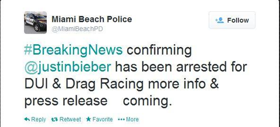 Justin Bieber đã bị bắt giữ vào khoảng hơn 4 giờ sáng ngày thứ Năm (23/1) tại thành phố Miami Beach của tiểu bang Florida (Mỹ). Ngôi sao người Canada bị cảnh sát bắt khi đang lái một chiếc xe Lamborghini thuê có màu vàng. Theo thông tin, anh bị bắt vì các tội danh: đua xe, điều khiển xe trong tình trạng bị ảnh hưởng bởi ma túy, chất có cồn, chống đối việc bắt giữ và dùng giấy phép lái xe quá thời hạn sử dụng.
