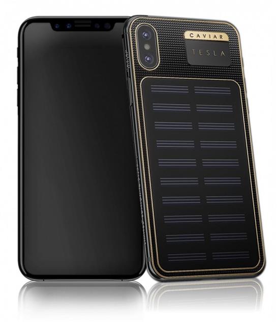 Trước đó, Caviar từng cho ra mắt iPhone X Tesla sạc bằng năng lượng mặt trời với tấm pin mặt trời được đặt ở mặt sau điện thoại. Theo hãng, bạn chỉ cần úp mặt điện thoại xuống, lưng điện thoại sẽ sử dụng ánh sáng để sạc điện thoại. Thân của chiếc điện thoại này được phủ một lớp PVD chống xước và chống sốc. Lớp viền ngoài của điện thoại và camera được phủ một lớp vàng 24K. Caviar chế tác ra chiếc iPhone X Tesla dựa trên cảm hứng từ 3 nhà khoa học vĩ đại "Nikola Tesla, Steve Jobs và Elon Musk". Chiếc điện thoại có giá khoảng 4.700 USD.