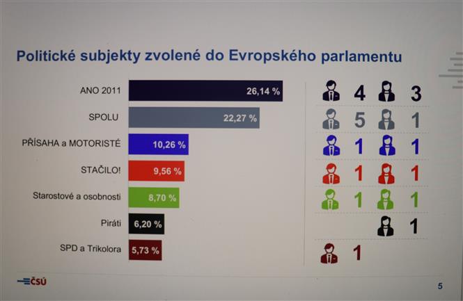 Kết quả bầu cử EP tại CH Séc do Cơ quan Thống kê Séc (CSU) công bố đêm 9/6. Phong trào ANO đứng đầu với 7 ghế giành được. Ảnh: Ngọc Biên/PV TTXVN tại CH Séc