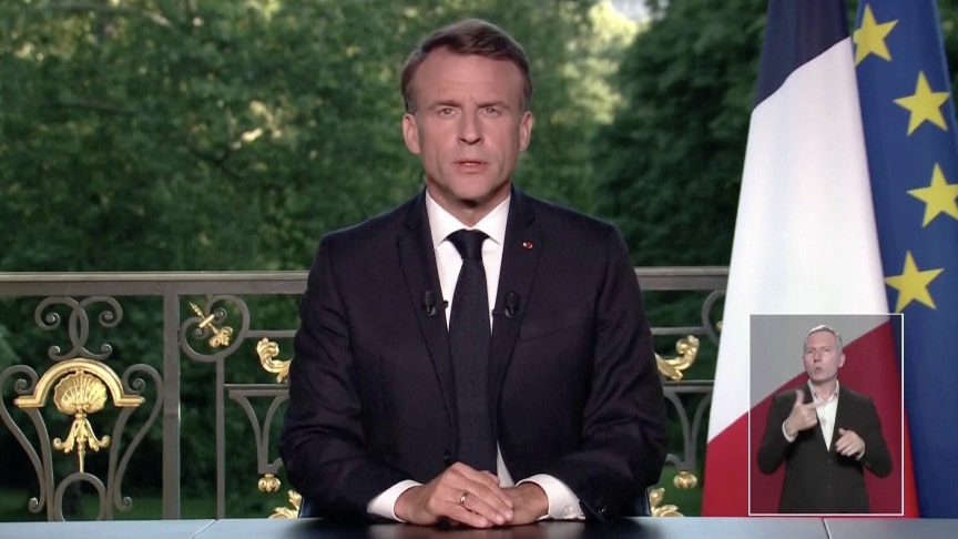 Tổng thống Pháp Emmanuel Macron tuyên bố giải tán Quốc hội vào tối  9/6/2024 sau khi liên minh ôn hòa của ông đã thất bại trong cuộc bầu cử Nghị viện châu Âu (EP) trước đảng Mặt trận Quốc gia (FN) theo đường lối cực hữu. Ảnh cắt từ clip của Văn phòng Tổng thống Pháp.