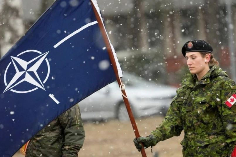 Một quân nhân cầm quốc kỳ khi chờ Thủ tướng Canada Justin Trudeau cùng Tổng Thư ký NATO Jens Stoltenberg đến Adazi, Latvia, ngày 8/3/2022. Ảnh: REUTERS