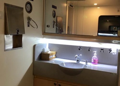 Đoàn tàu chất lượng "5 sao" này cũng trang bị hệ thống vệ sinh tự hoại công nghệ tiên tiến, bồn rửa mặt với vòi nước thiết bị cảm ứng, cửa phòng vệ sinh được thiết kế cửa gấp 2 cánh, rất tiện lợi khi sử dụng.