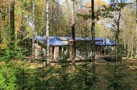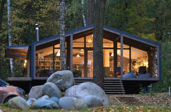 Ngôi nhà có khung kim loại kết hợp với bảng ván lát và kính làm cho nó phù hợp với môi trường xung quanh. Xung quanh nhà có những cây cao và thậm chí cả những tảng đá lớn.