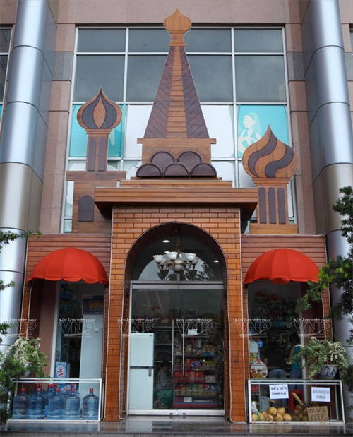 Cổng mang hình lâu đài được dựng trước một siêu thị mini ở chợ Nga mô phỏng nét kiến trúc đặc trưng của Nga.