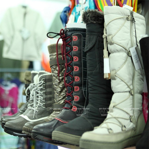 Du khách nước ngoài chọn mua giày tại một quầy hàng bán giày dép xuất khẩu ở chợ Nga.