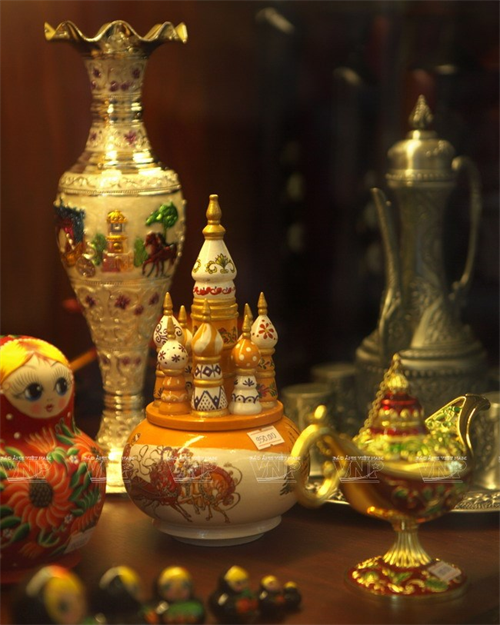 Một số đồ lưu niệm đặc trưng của Nga được bày bán tại siêu thị mini bên trong chợ Nga.