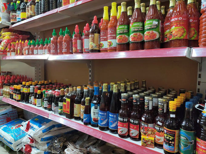 Ngoài hoa quả tươi, những thực phẩm đặc trưng của Việt Nam được bày bán phong phú từ xì dầu, nước mắm, tương ớt, nước tương đến mì tôm, măng, miến, trà khô...không khác gì siêu thị mini trong nước.