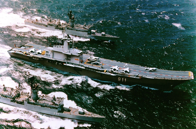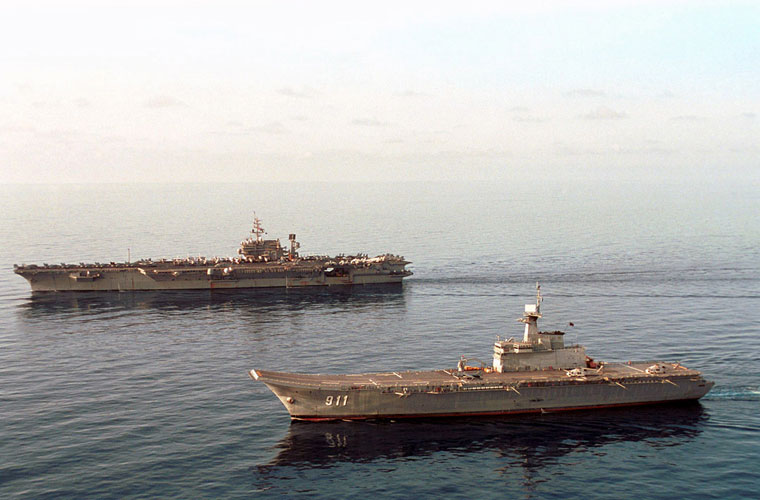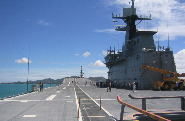 Năm 1992, Chính phủ Thái Lan đã ký hợp đồng với hãng Bazan (Tây Ban Nha) đóng mới tàu sân bay cho nước này với tổng trị giá hợp đồng 336 triệu USD. Năm 1997, Hải quân Thái Lan đã chính thức tiếp nhận chiếc tàu sân bay  mang tên HTMS Chakri Naruebet. Trong ảnh là tàu sân bay HTMS Chakri Naruebet (số hiệu 911) trong hoạt động diễn tập với Hải quân Mỹ.